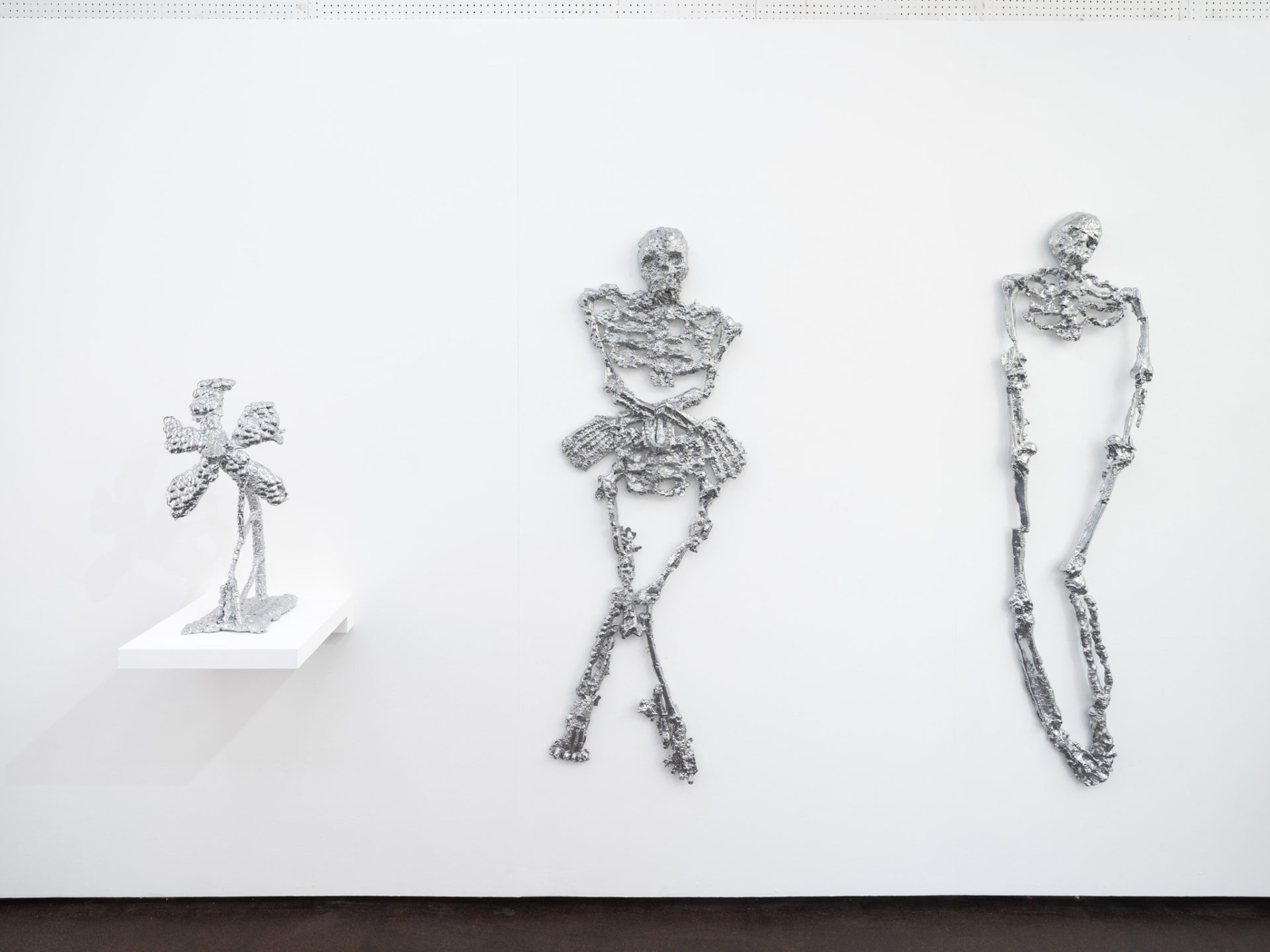 Jesse Pollock’s sculptural practice is rooted in the exploration of material, tradition, and the contradictions of contemporary rural life. Working primarily with cast and sheet aluminium, he distorts and reconstructs familiar objects—flowers, skulls, ladders, and flagons—through cutting, welding, and sandcasting. His process transforms rigid metal into fluid, patchwork forms that appear both ancient and futuristic, their powder-coated surfaces gleaming like relics of an unknown past or dystopian future.
